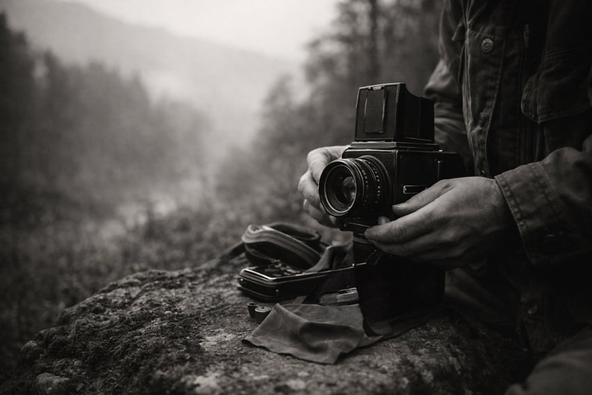 These fine art landscape photography prints start as traditional photographs: actual black-and-white negatives on 6x6 cm medium-format film, not digital files with filters. I shoot in forests and mountains, seasides and meadows (mostly quiet places), working with just 12 exposures per roll. That's the discipline. Every composition has to count.